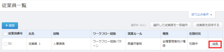 - 画面右上の「全権管理者メニュー」>「従業員」をクリックして、「従業員一覧」から、かざしているICカードを使用する従業員の「編集」をクリックします。
