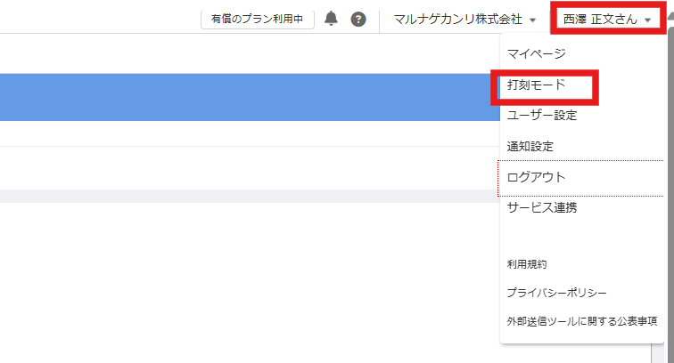 - マネーフォワード勤怠にログイン後、画面右上の「氏名」をクリック>「打刻モード」をクリックします。