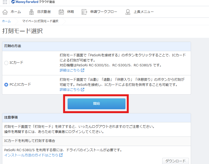 - いずれかの打刻モードにチェックを付け、「開始」をクリックします。