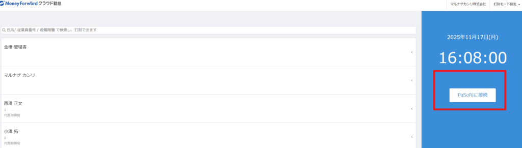 - 打刻モード画面の「PaSoRiに接続」をクリックし、接続を行います。