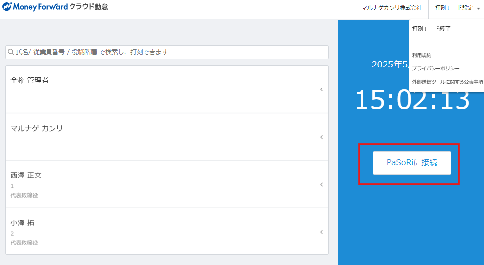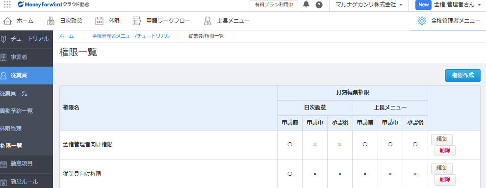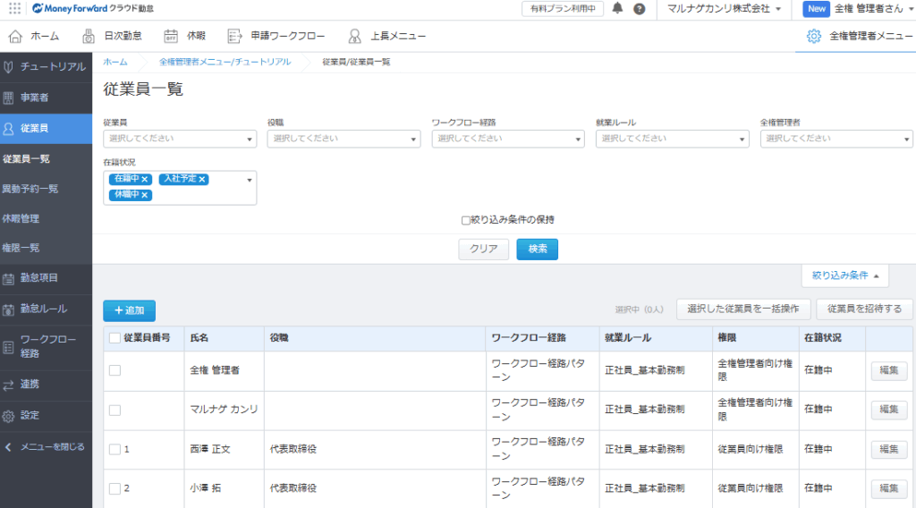 - 「全権管理者メニュー」>「従業員」>「従業員一覧」 画面を開く