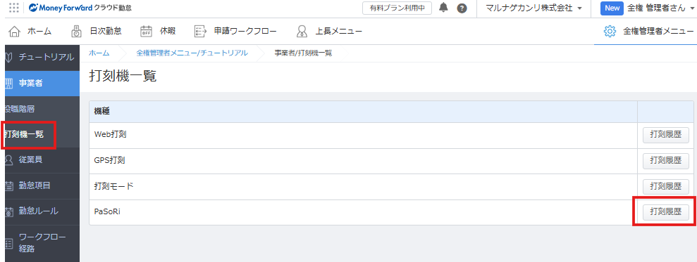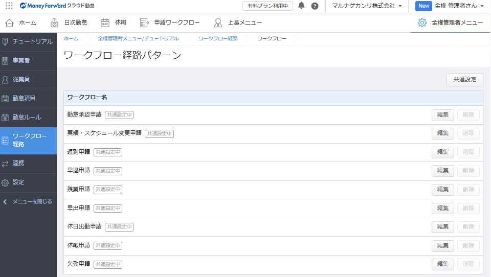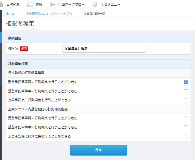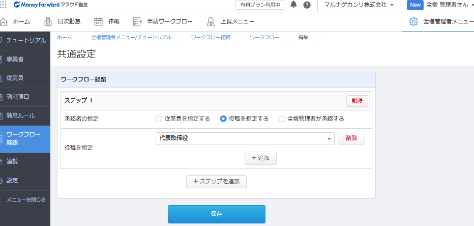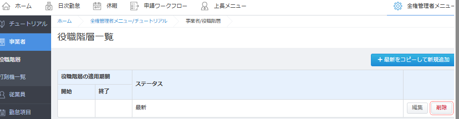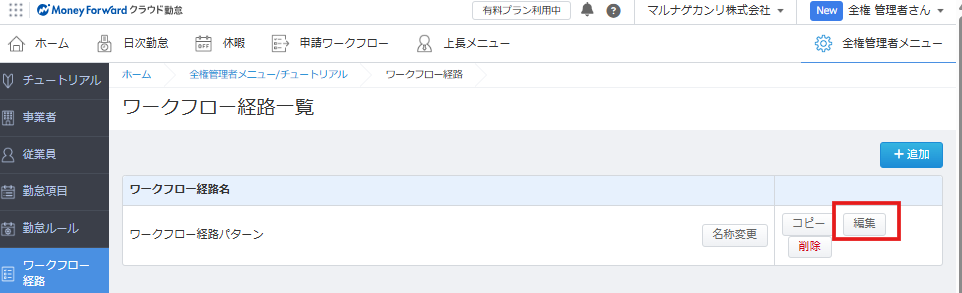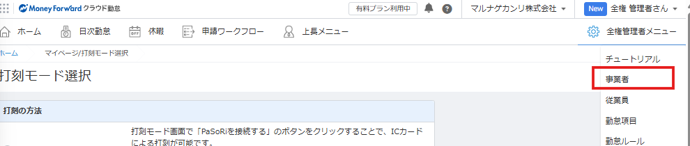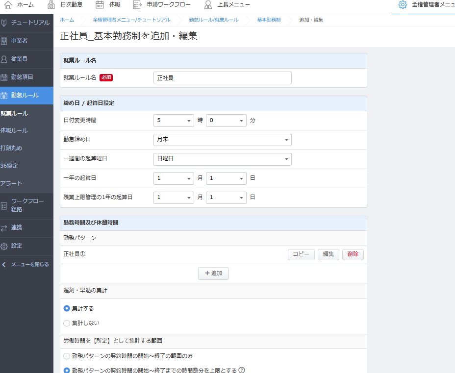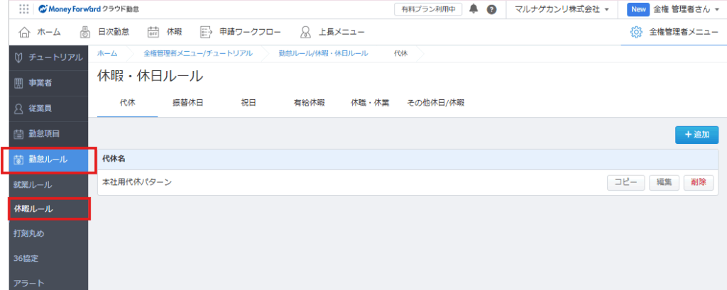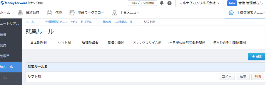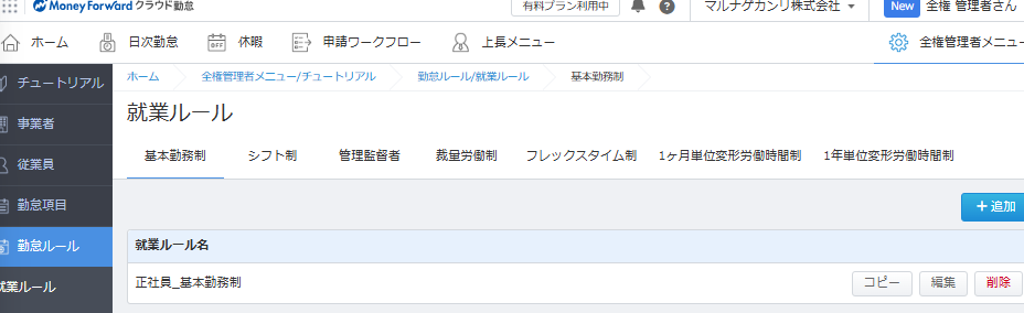 画面右上「全権管理者メニュー」>「勤怠ルール」、から作業を行う
