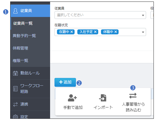 - 「従業員一覧」の画面左上の「追加」をクリック、「インポート」を選択
