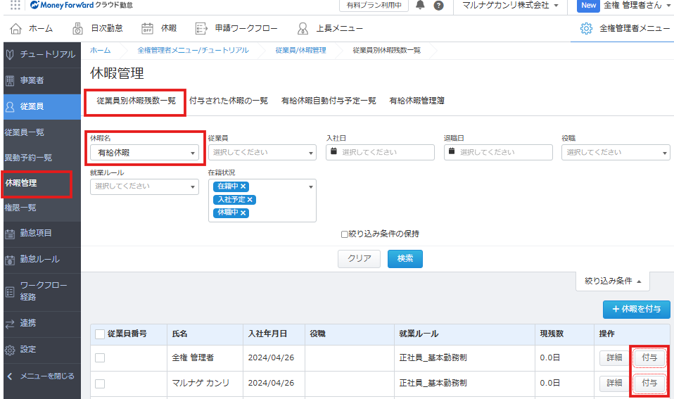 - 付与する休暇名(「有給休暇」など)を選択し、対象従業員の「付与」をクリック