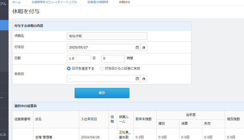 - 完了後、「休暇管理」から、従業員の「詳細」をクリックし、付与されたことを確認