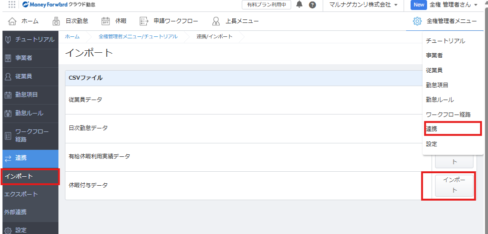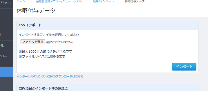 - 「全権管理者メニュー」>「連携」>「インポート」を開き、「休暇付与データ」の「インポート」をクリック