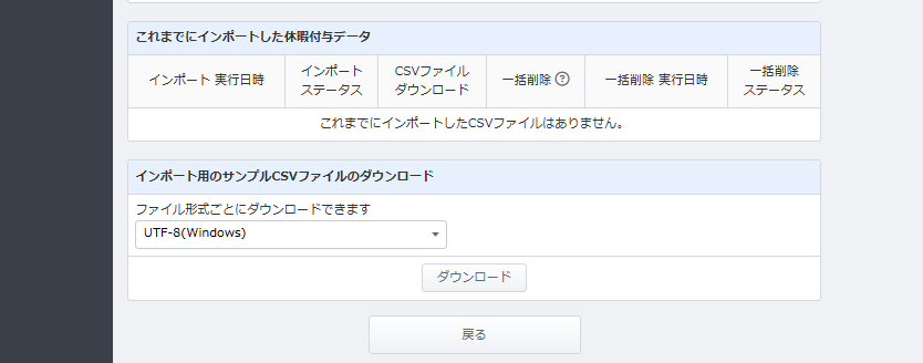 - 画面をスクロールし、「インポート用のサンプルCSVファイルのダウンロード」から、ファイル形式を選択し、ダウンロードをクリック