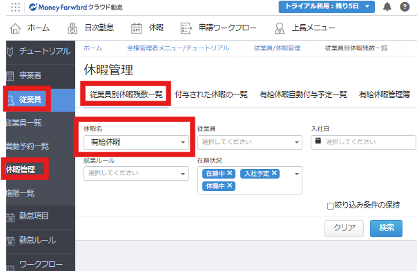- 「従業員」>「休暇管理」>「従業員別休暇残数一覧」を開く