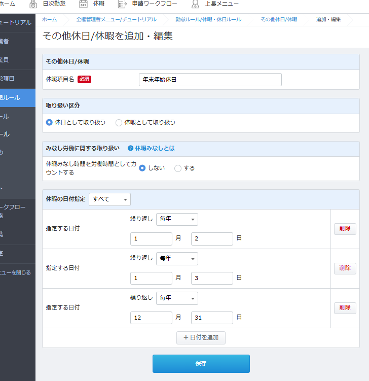 - 新たな「日付を指定する休日/休暇」「日付を指定しない休日/休暇」を設定する場合は「追加」をクリック