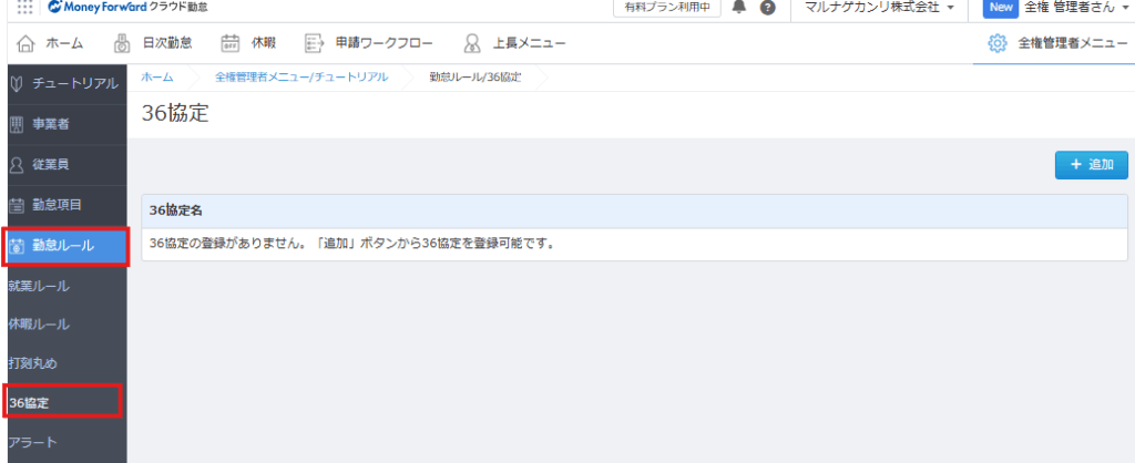 - 「36協定」画面を選択し、画面の右上の「追加」をクリック