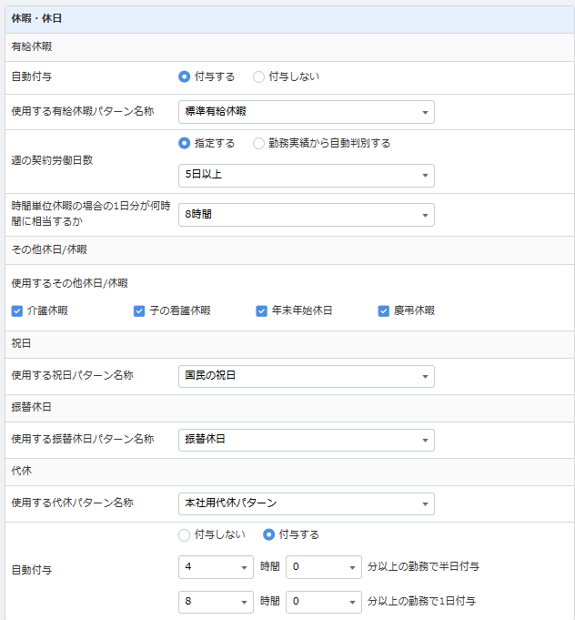 - 祝日パターンの仕様上、1人の従業員(=1つの就業ルール)に1つのパターンしか紐づけできない。また、祝日パターンは休日or休暇で一律設定されてしまう。