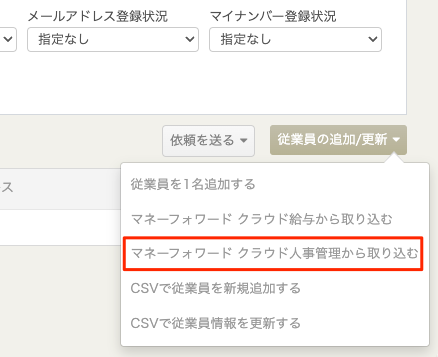- 「提供者一覧」画面で「従業員」タブを選択>「従業員の追加/更新」をクリックし、「マネーフォワード クラウド人事管理から取り込む」を選択