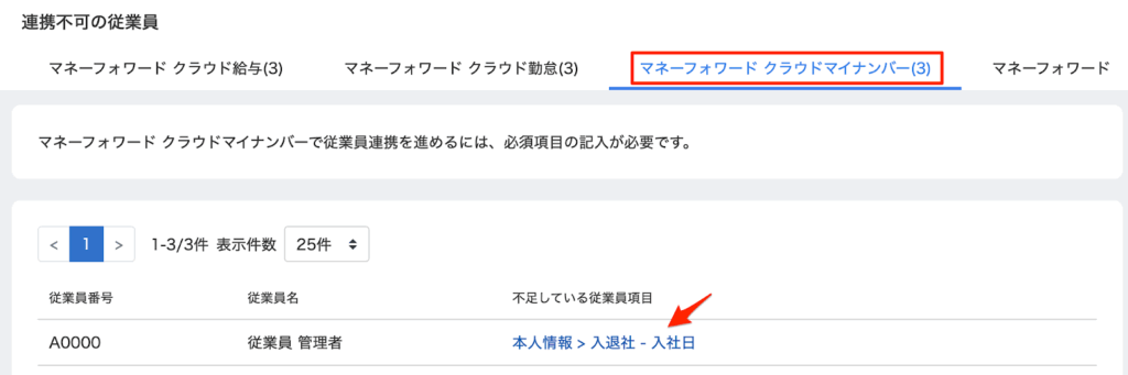- 「マネーフォワード クラウドマイナンバー」のタブを選択すると、連携する上で必要な従業員情報が不足している従業員が表示されるので、不足している従業員項目をクリックして編集する。