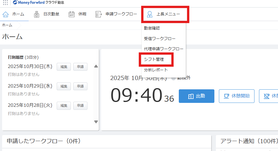 - 「全権管理者」または「部下」がいる「上長」のみ、「シフト管理」メニューが表示され、シフト作成ができる。