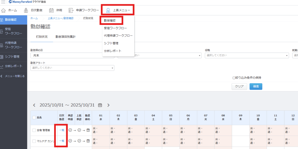 - 更に詳細を確認したい場合には、「日次勤怠」の「一覧」をクリックし、各従業員の日次勤怠画面を確認する