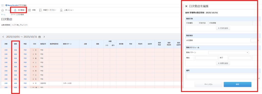 - 従業員の「日次勤怠」画面から(上長メニューではない点に注意)、各日付の「編集」をクリックし、従業員の打刻を追加、編集する