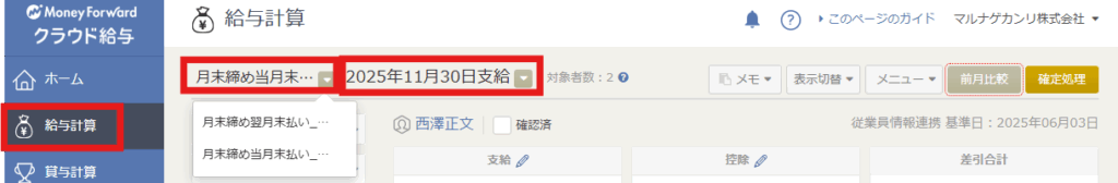 - MF給与で、「給与計算」画面を開き、「給与計算を行う締め日グループ」と「給与計算を行う支給日」を選択する