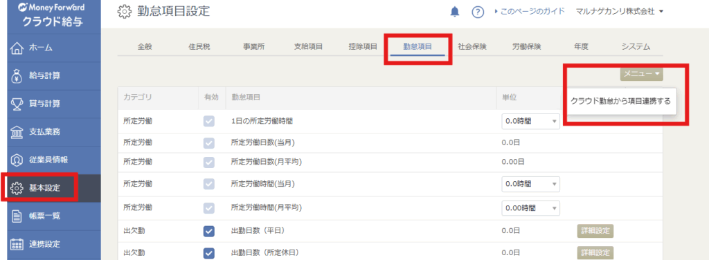 - 「基本設定」>「勤怠項目」から、「メニュー」>「クラウド勤怠から項目連携する」をクリック