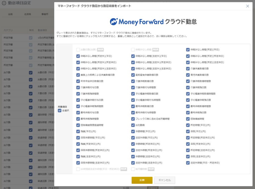 - 「マネーフォワードクラウド勤怠 から勤怠項目をインポート」画面で、取り込みたい勤怠項目をチェックして「反映」をクリック