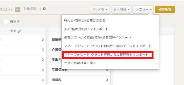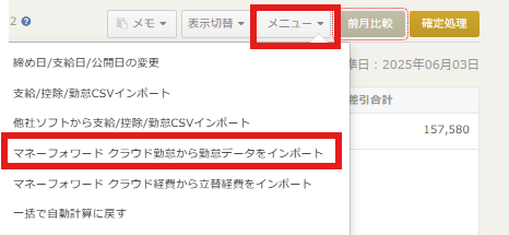 - 「給与計算」画面で「メニュー」をクリックし、「マネーフォワード クラウド勤怠から勤怠データをインポート」を選択