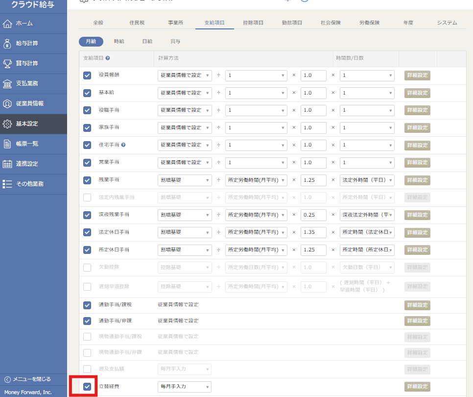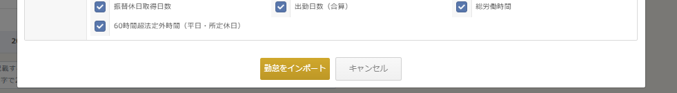 - 例:まず4/1〜4/30で残業項目の時間のみチェックを入れて連携、次に、5/1〜5/31の残業項目のチェックを外してその他の日数や時間を連携、の流れで行うと給与で設定した自動計算されるようにする。