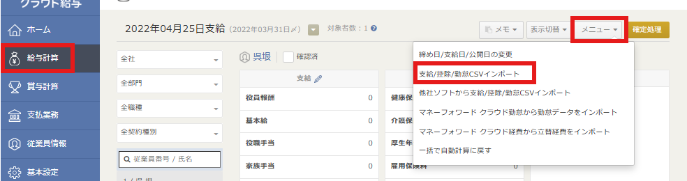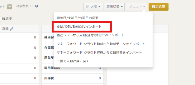 - 「給与計算」>メニュー>「支給/控除/勤怠CSVインポート」をクリック