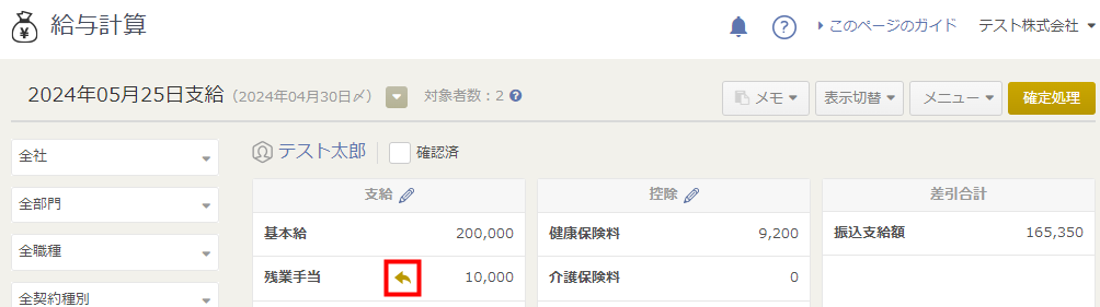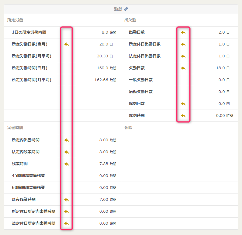 - 「給与計算」画面でインポートが成功したかを確認する(対象の勤怠項目に黄色の矢印が表示されていれば、連携は成功)