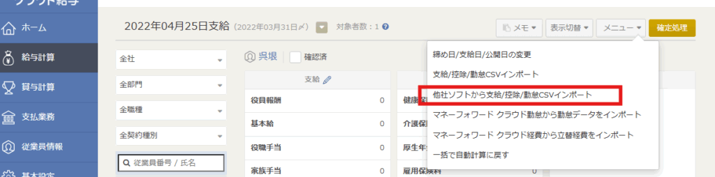 - 「給与計算」画面から「メニュー」をクリックし、「他社ソフトから支給/控除/勤怠CSVインポート」を選択