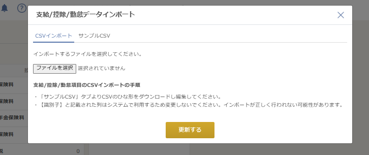 - 給与計算の画面の「メニュー」>「支給/控除/勤怠データインポート」を選択し、作成されたファイルを選択し「更新する」をクリックする。