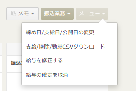 - 「賞与計算」画面右上の「振込業務」をクリックすると、「賞与振込のFBデータ出力」「賞与振込一覧表で確認」を選択できるようになるので、「賞与振込のFBデータ出力」をクリックすると、「支払業務」画面でFBデータの出力が可能となる。