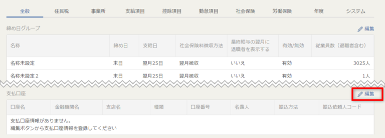 - 以下の画像サンプルでは役員が月末締め当月末払い、従業員が月末締め翌月末払いとして、任意の締日グループ名称を付けている。