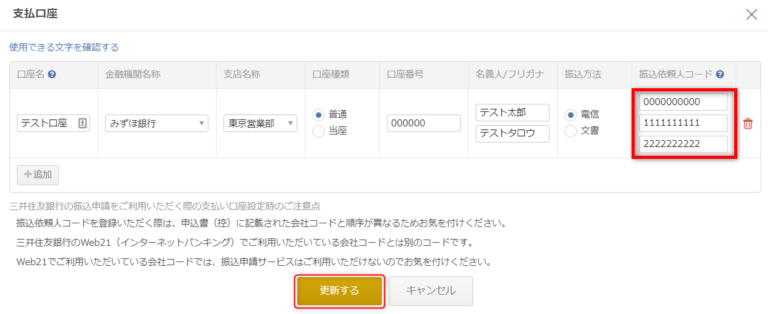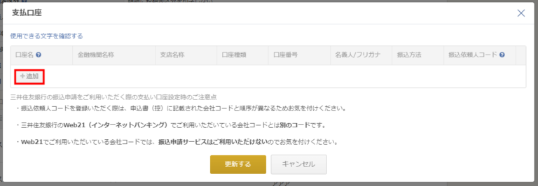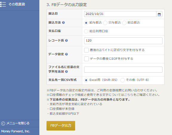 - 「3.FBデータの出力設定」で必要な情報を選択、入力すると、支払口座は「基本設定」>「全般」>「支払口座」で設定した口座が表示される
