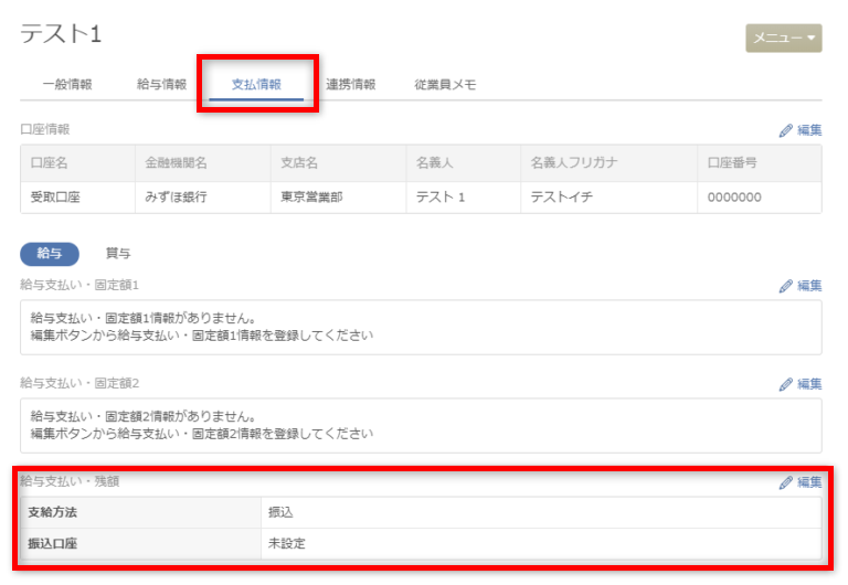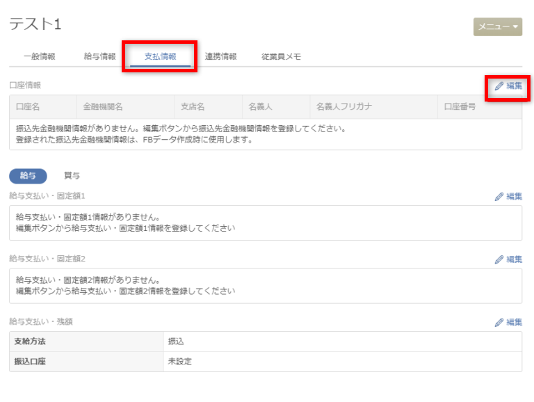 - 賞与の振込口座を変更する場合は、「従業員情報」>「支払情報」から賞与振込用の口座を追加し、「賞与」タブから振込口座に登録する。