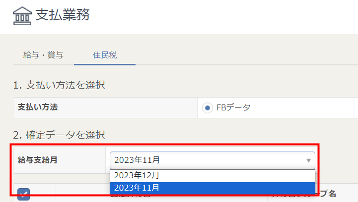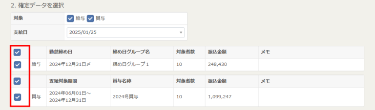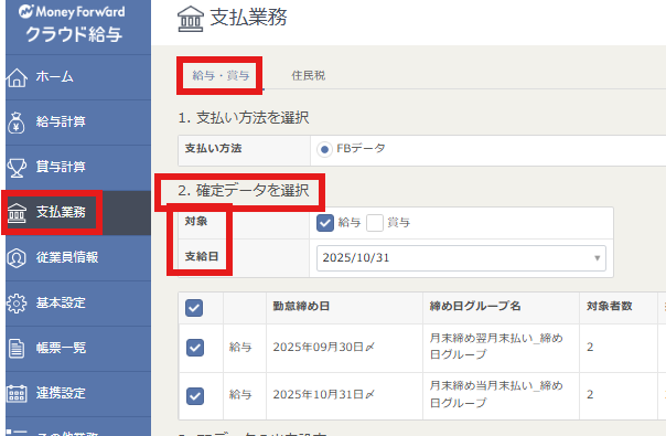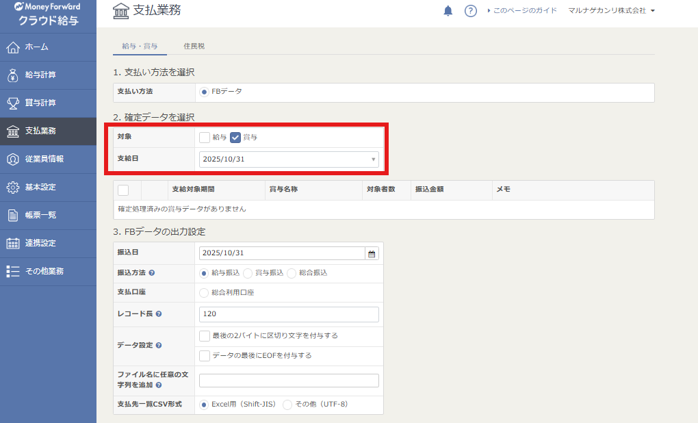 - 「2.確定データを選択」からFBデータを出力する「対象」「支給日」「賞与」を選択