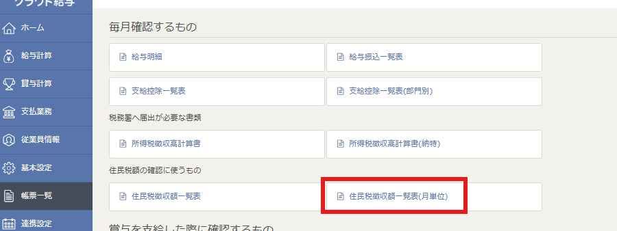 - 「帳票一覧」画面から、賞与振込一覧表を選択