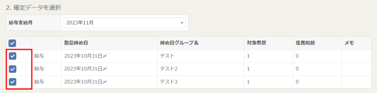 - 「集計期間」で、マネーフォワード クラウド給与の「締め日」期間に該当する期間にチェックをいれる