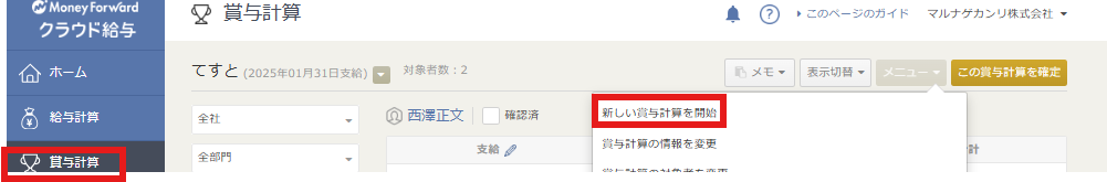 - 2回目以降の賞与計算を開始する場合、「賞与新規作成」>「賞与計算」>「メニュー」>「新しい賞与を開始」から賞与計算を開始