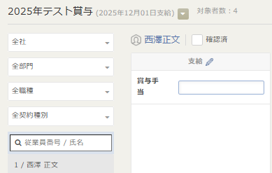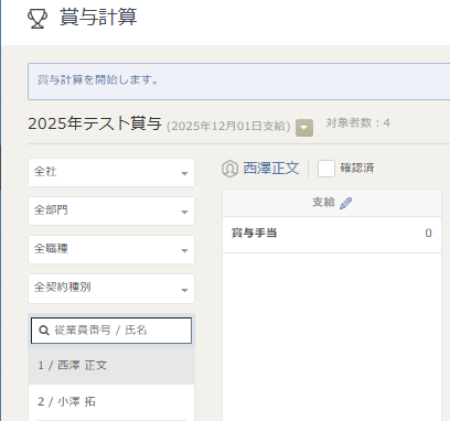 - 「賞与計算を開始します」という文言が出てきた後、左側に賞与対象の従業員が一覧で表示されるため、選択すると、画面中央の賞与計算の入力画面が表示される。