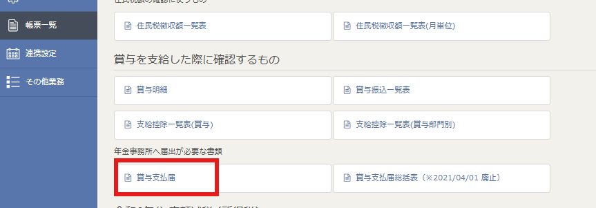 - 「帳票一覧」画面から、賞与支払届を選択する