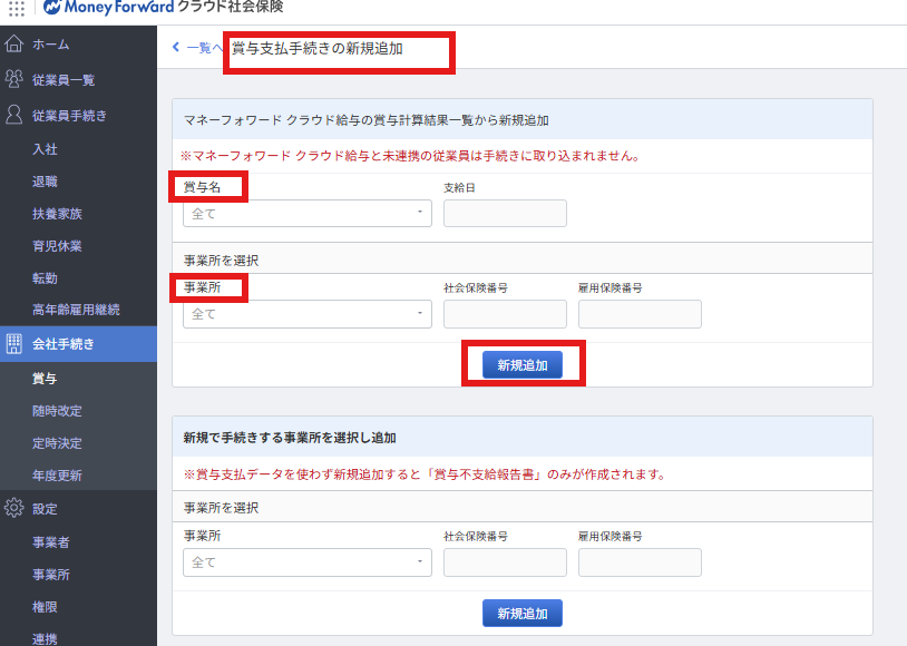 - 「賞与支払手続きの新規追加」画面で「賞与名」「事業所」を選択し、「新規追加」をクリック