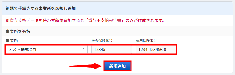 - 「新規で手続きする事業所を選択し追加」で「事業所」を選択し、「賞与不支給報告書」にチェックを入れ、「新規追加」をクリック