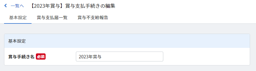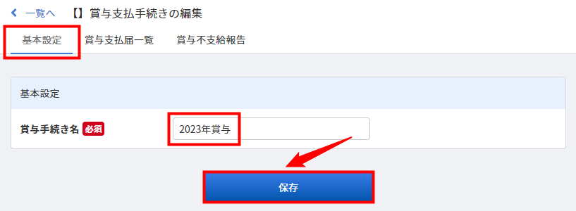 - 「賞与支払手続き」が追加されると、「賞与支払手続きの編集」画面に遷移するので、「基本設定」タブを選択し、「賞与手続き名」を入力して「保存」をクリック