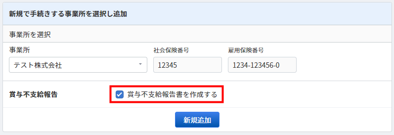- 「賞与不支給報告書を作成する」にチェックを入れ、「新規追加」をクリック