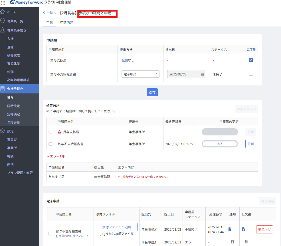 - マネーフォワードクラウド社会保険「賞与支払手続き一覧」画面で「申請」をクリックすると、「手続きの確認と申請」画面が表示される。