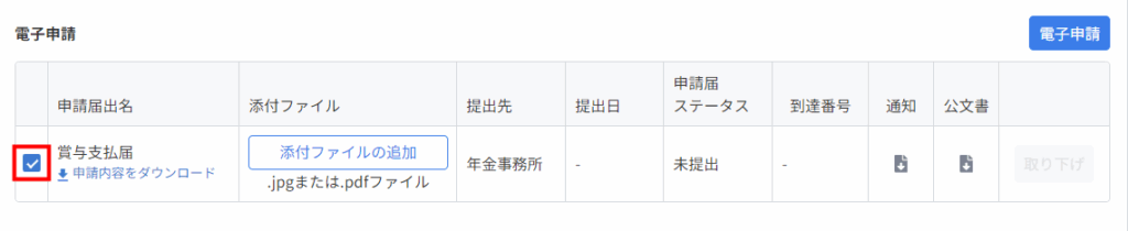- マネーフォワードクラウド社会保険でサイドバー「会社手続」>「賞与」>「賞与支払手続き一覧」画面>「申請」ボタン>「電子申請」する申請届出名にチェックを入れる