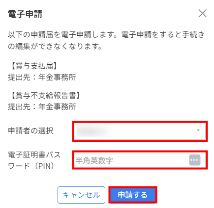 - 「電子証明書パスワード(PIN)」の項目が表示された場合は、パスワードを入力のうえ「申請する」をクリックする