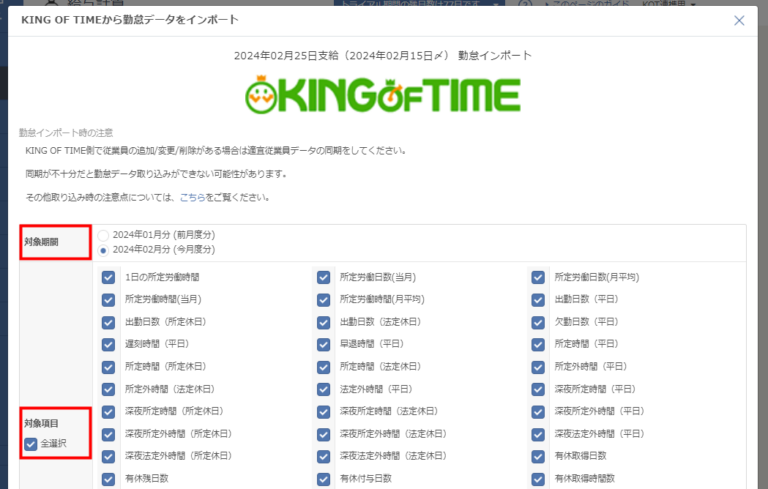 - 「KING OF TIMEから勤怠データをインポート」画面で「対象期間」と「対象項目」を選択する