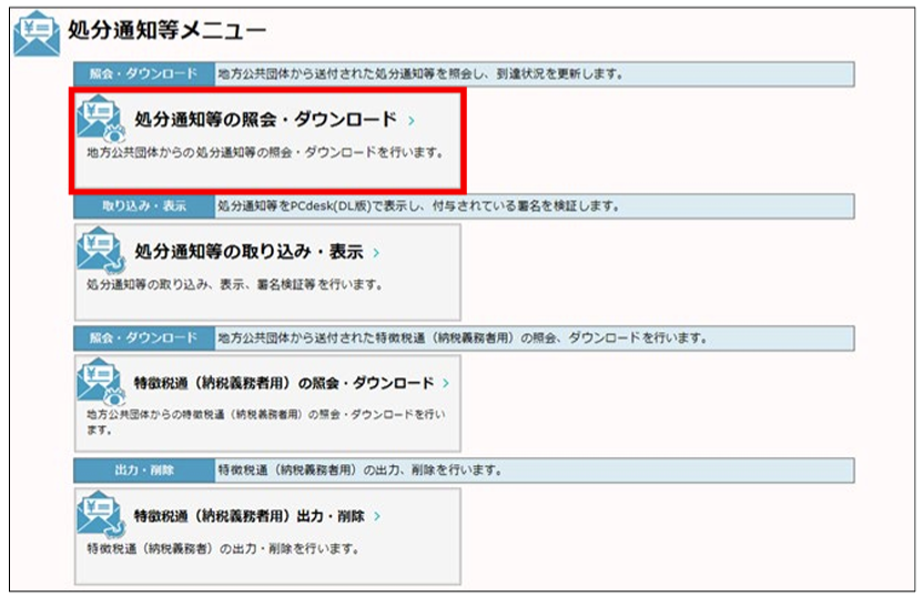 • 「メインメニュー」画面で「処分通知等に関する手続き」をクリックし、表示された「処分通知等メニュー」画面から「処分通知等の照会・ダウンロード」をクリックして操作を行う