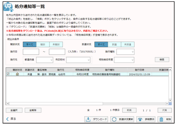• 「到達状況」が「未達」の処分通知等は削除できない