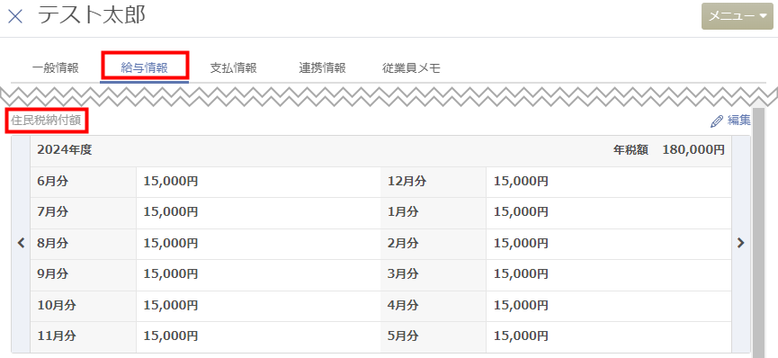 • 「従業員情報」>「給与情報」>「住民税納付額」から金額を入力する